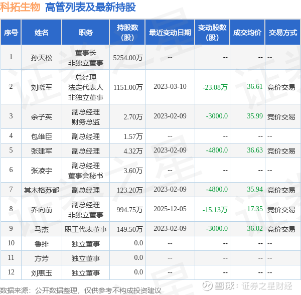 科拓生物的高管列表及最新持股情况如下: