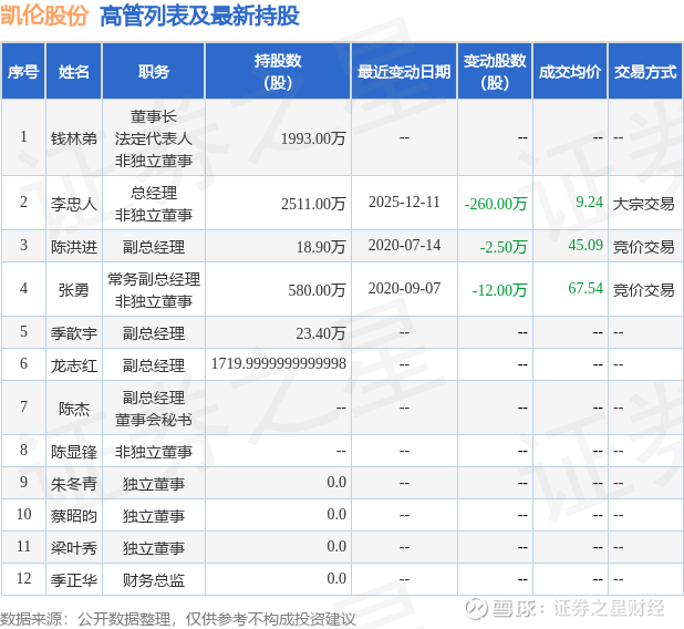 凯伦股份近半年内的董监高及核心技术人员增减持详情如下: