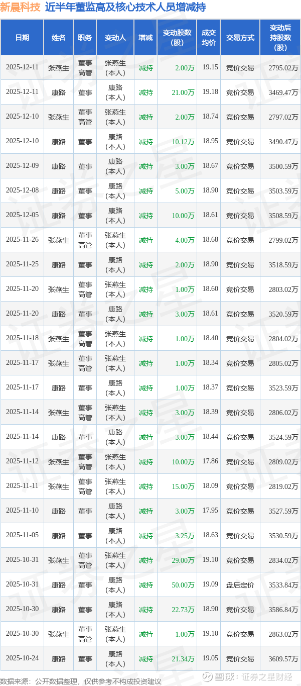 新晨科技近半年内的董监高及核心技术人员增减持详情如下: