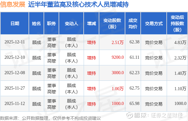 证券之星消息,根据12月12日市场公开信息、上市公司公告及交易所披露数据整理,信息发展(300469)最新董监高及相关人员股份变动情况:2025年12月11日公司董事,高管顾成共增持公司股份2.51万股,占公司总股本为0.0101%。变动期间公司股价上涨0.55%,12月11日当日收盘报62.16元。
