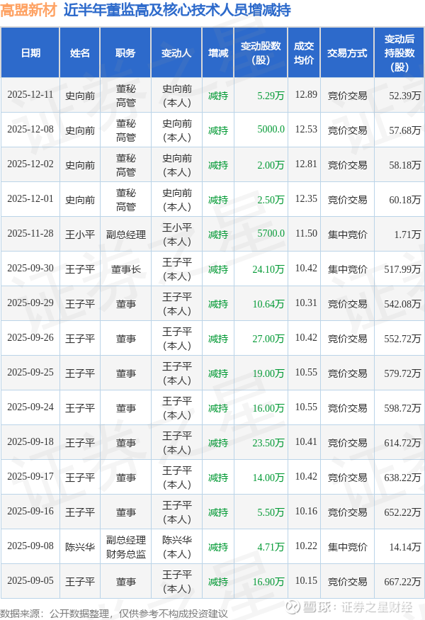 高盟新材近半年内的董监高及核心技术人员增减持详情如下: