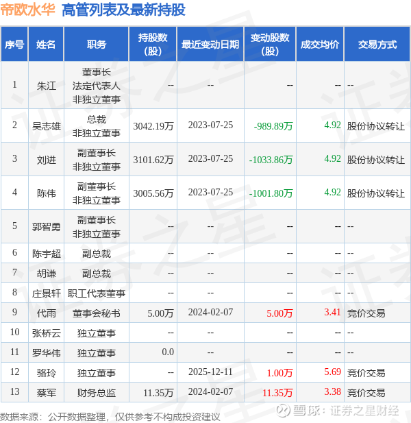 帝欧水华近半年内的董监高及核心技术人员增减持详情如下: