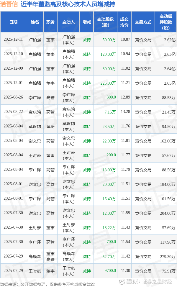 证券之星消息,根据12月12日市场公开信息、上市公司公告及交易所披露数据整理,诺普信(002215)最新董监高及相关人员股份变动情况:2025年12月11日公司董事卢柏强共减持公司股份50.0万股,占公司总股本为0.0497%。变动期间公司股价下跌1.37%,12月11日当日收盘报10.77元。