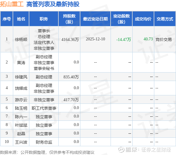 拓山重工的高管列表及最新持股情况如下: