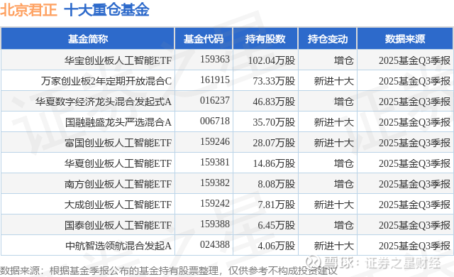 重仓北京君正的前十大公募基金请见下表: