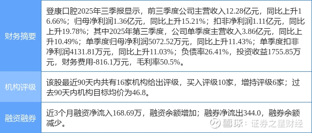 2025年10月26日,国金证券研究员赵中平,张杨桓发布了对登康口腔的研报《Q3主动控费效果初现,中长期发展逻辑依然清晰》,该研报对登康口腔给出“买入”评级。研报中预计公司 25-27 年归母净利分别为 1.9、 2.3、 2.8 亿元,当前股价对应 PE 分别为 40、 33、 28X, 维持“买入”评级。证券之星数据中心根据近三年发布的研报数据计算,该研报作者对此股的盈利预测准确度为79.91%。