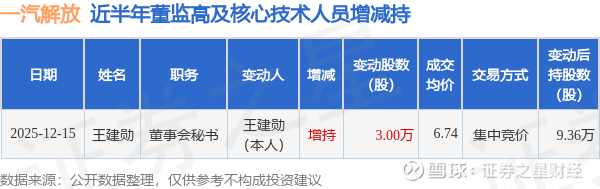 证券之星消息,根据12月15日市场公开信息、上市公司公告及交易所披露数据整理,一汽解放(000800)最新董监高及相关人员股份变动情况:2025年12月15日公司董事会秘书王建勋共增持公司股份3.0万股,占公司总股本为0.0006%。变动期间公司股价下跌1.46%,12月15日当日收盘报6.73元。