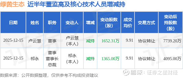 证券之星消息,根据12月15日市场公开信息、上市公司公告及交易所披露数据整理,绿茵生态(002887)最新董监高及相关人员股份变动情况:2025年12月15日公司董事,董事长,总裁祁永、董事卢云慧共减持公司股份3017.31万股,占公司总股本为9.8609%。变动期间公司股价上涨1.23%,12月15日当日收盘报9.04元。