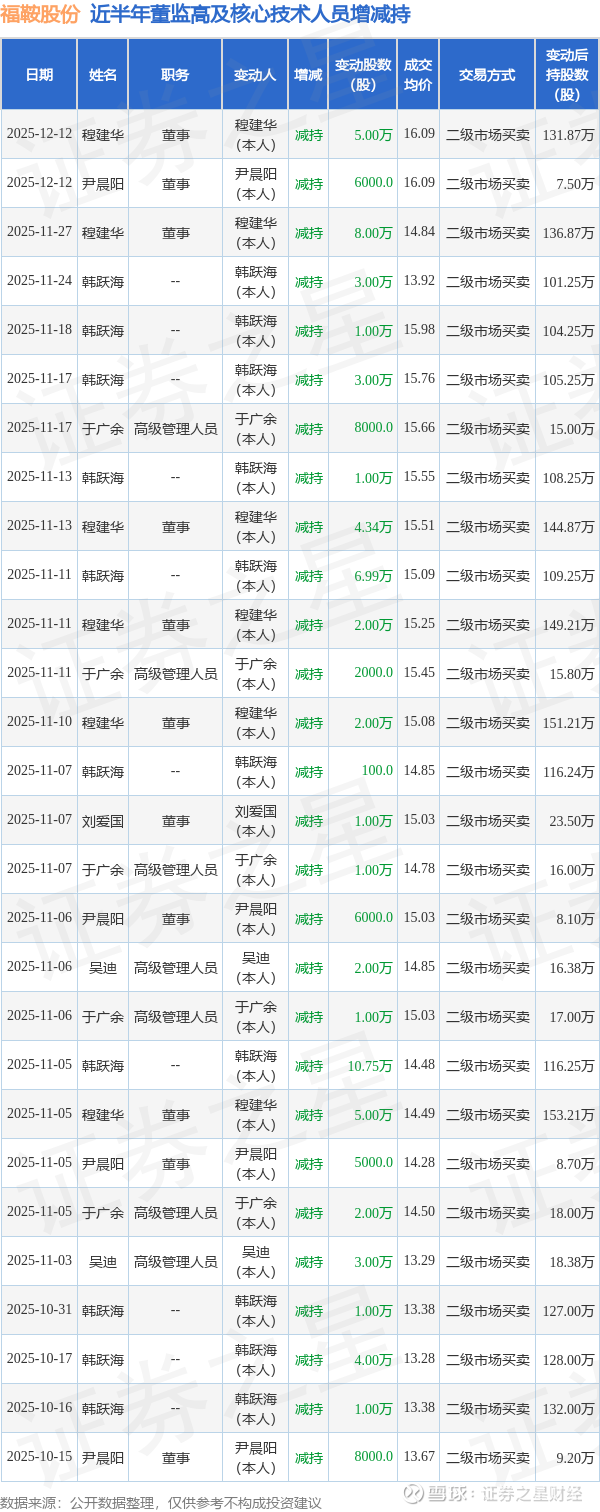 福鞍股份近半年内的董监高及核心技术人员增减持详情如下: