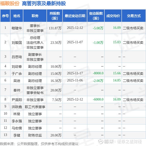 证券之星消息,根据12月15日市场公开信息、上市公司公告及交易所披露数据整理,福鞍股份(603315)最新董监高及相关人员股份变动情况:2025年12月12日公司董事穆建华、董事尹晨阳共减持公司股份5.6万股,占公司总股本为0.0175%。变动期间公司股价上涨7.93%,12月12日当日收盘报15.79元。