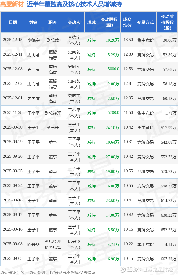 高盟新材近半年内的董监高及核心技术人员增减持详情如下: