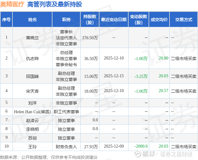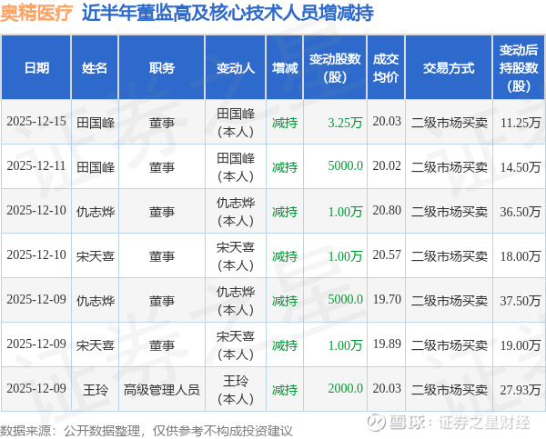 证券之星消息,根据12月15日市场公开信息、上市公司公告及交易所披露数据整理,奥精医疗(688613)最新董监高及相关人员股份变动情况:2025年12月11日至2025年12月15日公司董事田国峰共减持公司股份3.75万股,占公司总股本为0.0273%。变动期间公司股价下跌0.1%,12月15日当日收盘报20.02元。