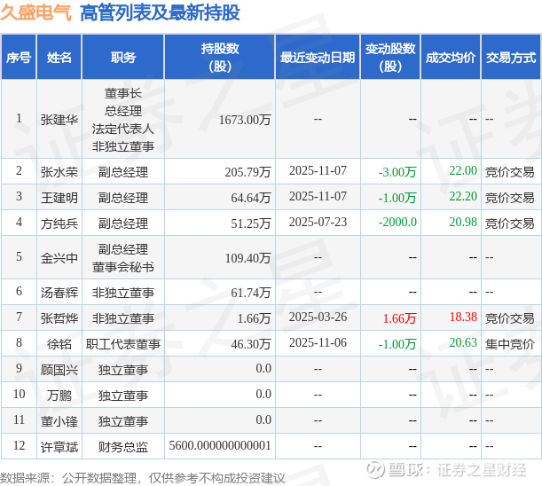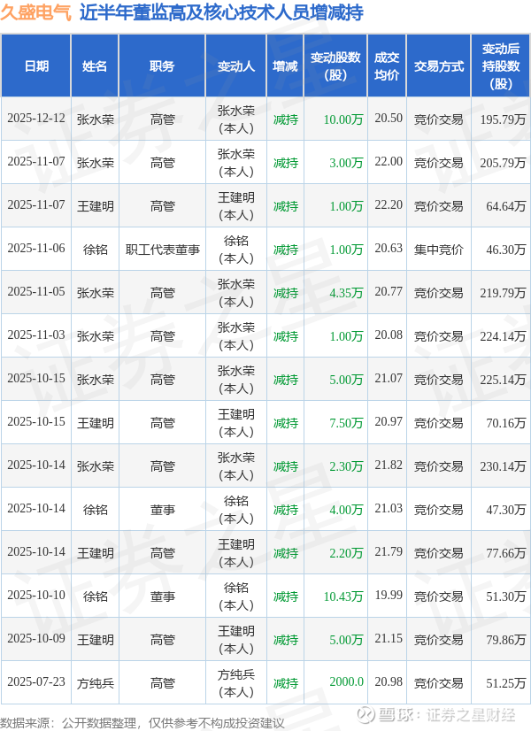 久盛电气近半年内的董监高及核心技术人员增减持详情如下: