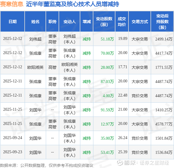赛意信息近半年内的董监高及核心技术人员增减持详情如下: