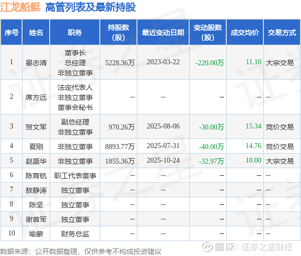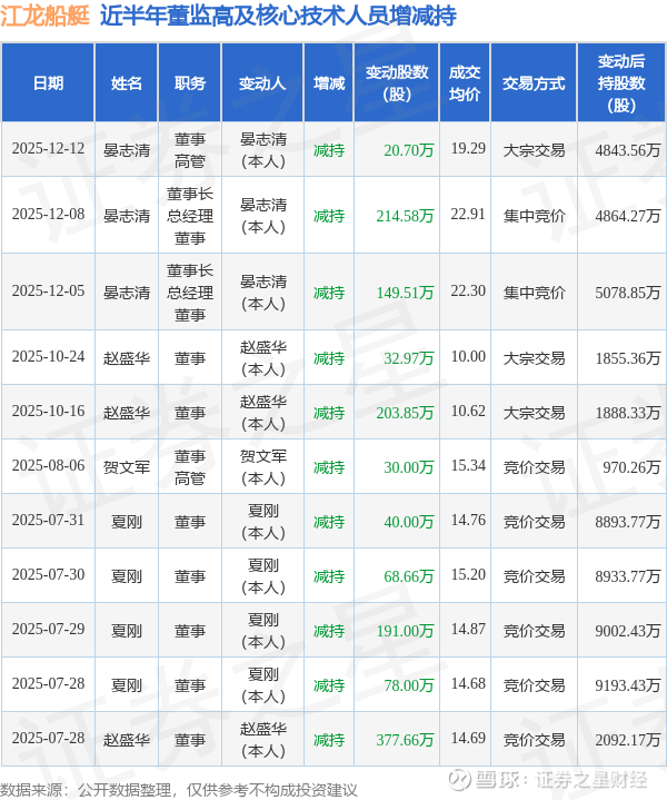 江龙船艇近半年内的董监高及核心技术人员增减持详情如下:
