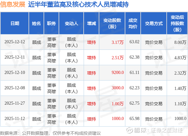 证券之星消息,根据12月15日市场公开信息、上市公司公告及交易所披露数据整理,信息发展(300469)最新董监高及相关人员股份变动情况:2025年12月12日公司董事,高管顾成共增持公司股份3.17万股,占公司总股本为0.0128%。变动期间公司股价上涨1.17%,12月12日当日收盘报62.89元。