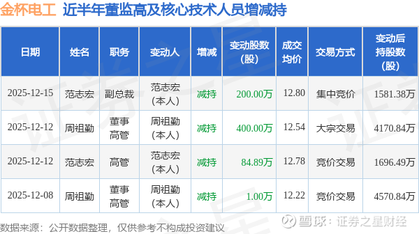 证券之星消息,根据12月15日市场公开信息、上市公司公告及交易所披露数据整理,金杯电工(002533)最新董监高及相关人员股份变动情况:2025年12月12日公司董事,高管周祖勤、高管范志宏共减持公司股份484.89万股,占公司总股本为0.6607%。变动期间公司股价上涨4.34%,12月12日当日收盘报12.73元。