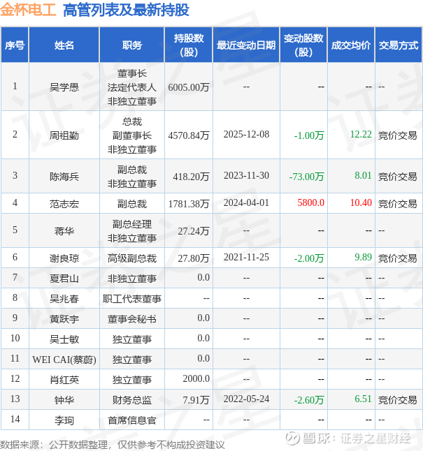 金杯电工的高管列表及最新持股情况如下: