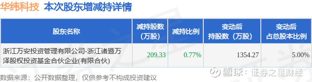 证券之星消息,12月15日华纬科技发布公告《华纬科技:简式权益变动报告书》,其股东浙江万安投资管理有限公司-浙江诸暨万泽股权投资基金合伙企业(有限合伙)于2025年12月2日至2025年12月12日间合计减持209.33万股,占公司目前总股本的0.7728%,变动期间该股股价下跌4.93%,截止12月12日收盘报22.56元。
