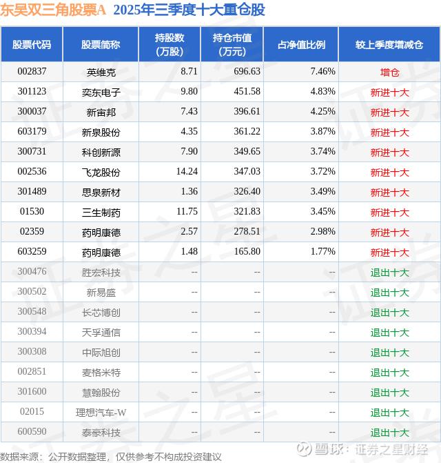 东吴双三角股票A的前十大重仓股如下: