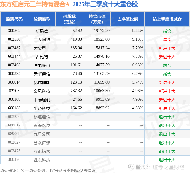 根据2025基金Q3季报公募基金重仓股数据,重仓该股的公募基金共91家,其中持有数量最多的公募基金为东方红资产管理的东方红启元三年持有混合A。东方红启元三年持有混合A目前规模为5.59亿元,最新净值4.7643(12月15日),较上一交易日下跌1.0%,近一年上涨70.46%。该公募基金现任基金经理为傅奕翔。傅奕翔在任的基金产品包括:东方红启程三年持有混合A,管理时间为2022年7月4日至今,期间收益率为8.11%;东方红优势精选混合,管理时间为2022年7月16日至今,期间收益率为8.36%;