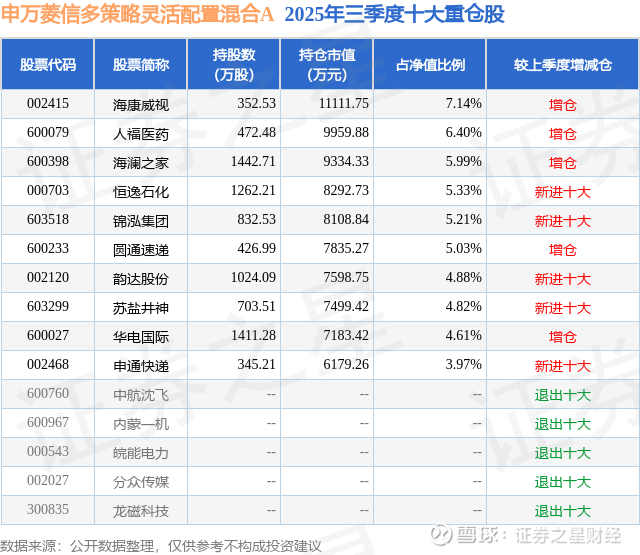 申万菱信多策略灵活配置混合A的前十大重仓股如下: