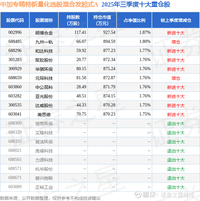 中加专精特新量化选股混合发起式A的前十大重仓股如下: