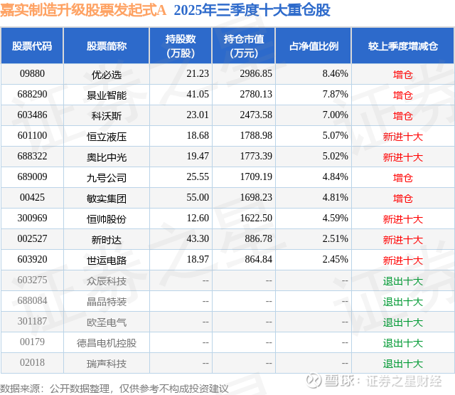 根据2025基金Q3季报公募基金重仓股数据,重仓该股的公募基金共4家,其中持有数量最多的公募基金为嘉实基金的嘉实制造升级股票发起式A。嘉实制造升级股票发起式A目前规模为0.61亿元,最新净值1.4837(12月15日),较上一交易日下跌1.9%,近一年上涨37.58%。该公募基金现任基金经理为孟夏。孟夏在任的基金产品包括:嘉实优势成长混合A,管理时间为2020年7月22日至今,期间收益率为48.06%;嘉实领先成长混合,管理时间为2022年11月2日至今,期间收益率为12.75%;嘉实成长驱动混合A,管理时间为2023年9月22日至今,期间收益率为69.58%。