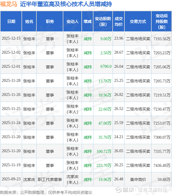福龙马近半年内的董监高及核心技术人员增减持详情如下: