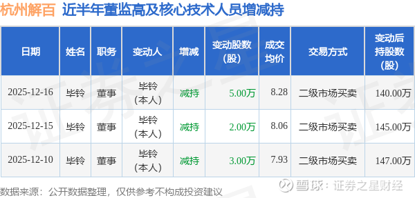 杭州解百近半年内的董监高及核心技术人员增减持详情如下: