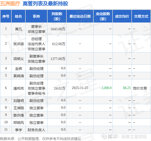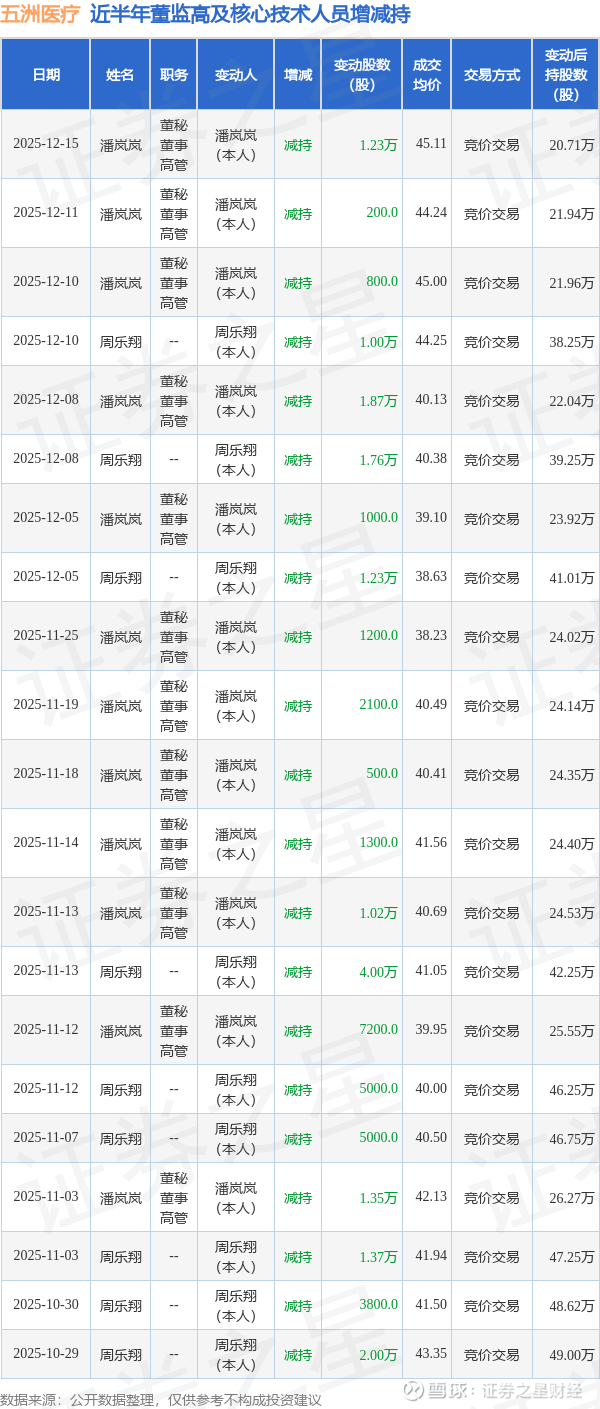五洲医疗近半年内的董监高及核心技术人员增减持详情如下: