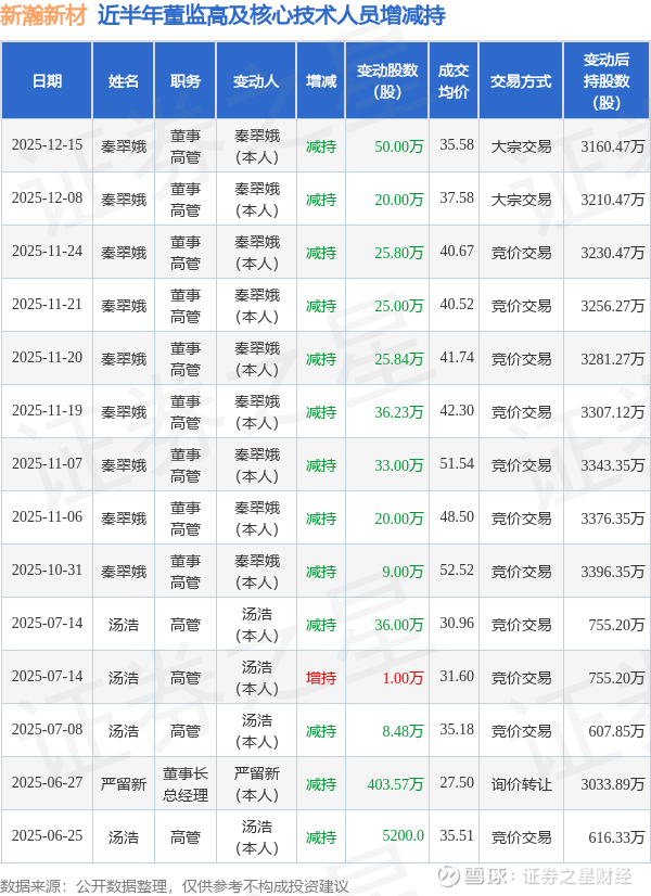新瀚新材近半年内的董监高及核心技术人员增减持详情如下: