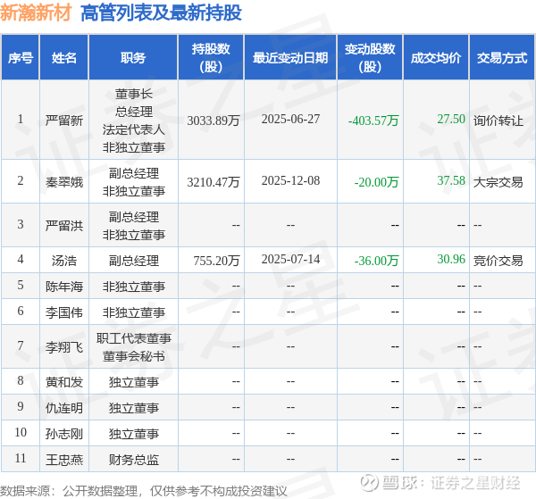新瀚新材的高管列表及最新持股情况如下:
