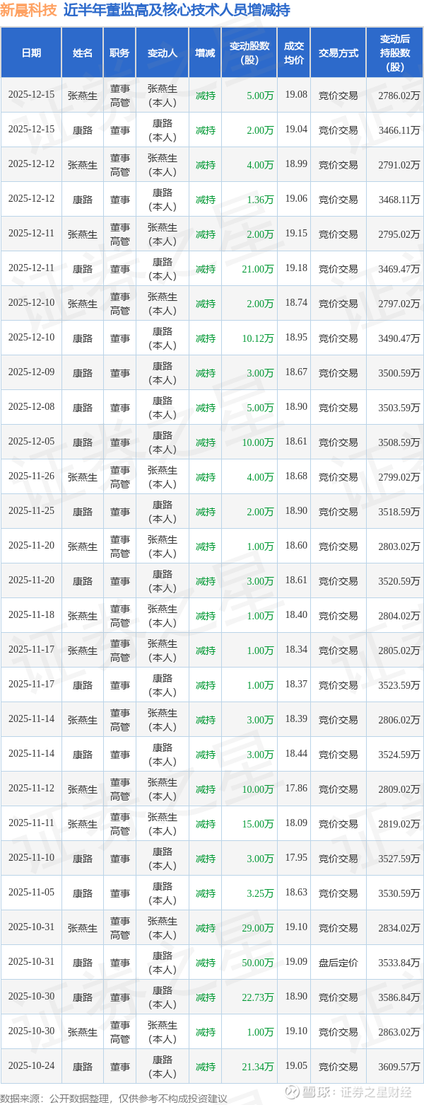 新晨科技近半年内的董监高及核心技术人员增减持详情如下: