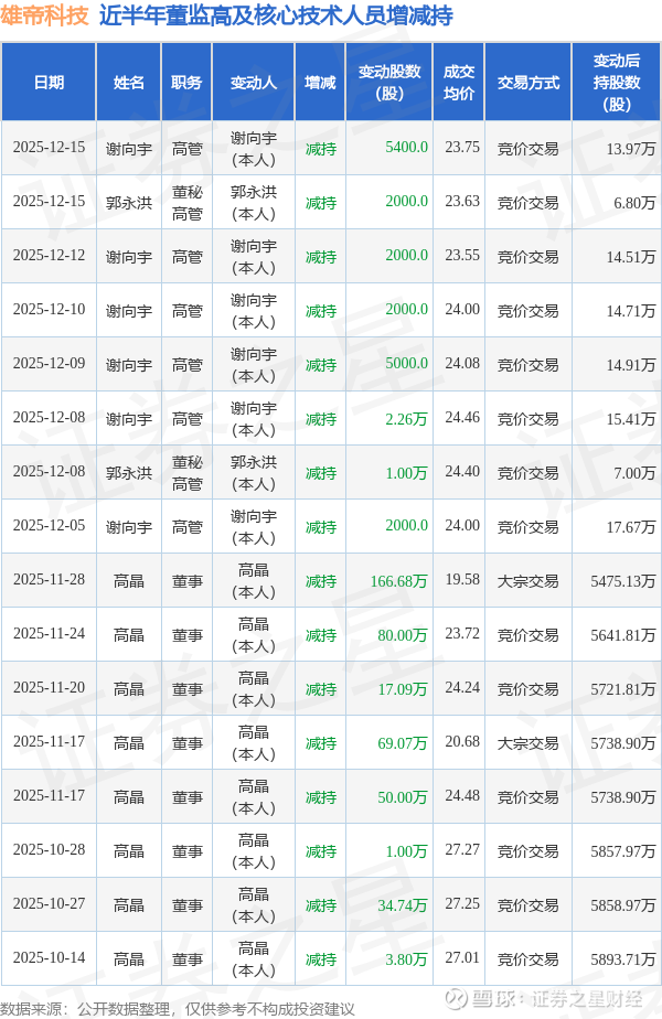 雄帝科技近半年内的董监高及核心技术人员增减持详情如下: