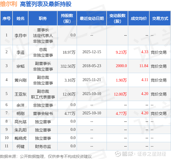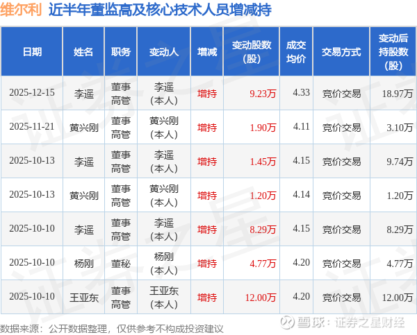 维尔利近半年内的董监高及核心技术人员增减持详情如下: