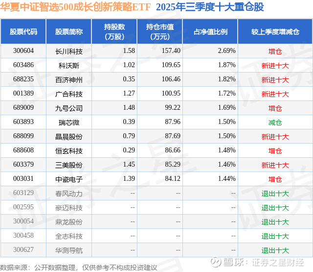 华夏中证智选500成长创新策略ETF的前十大重仓股如下: