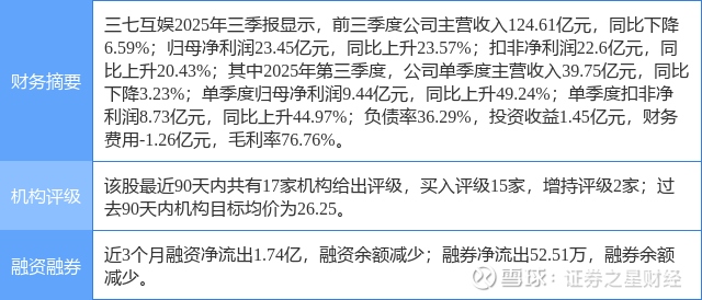 2025年10月30日,东吴证券研究员张良卫发布了对三七互娱的研报《2025年三季报点评:业绩超预期,关注新品上线进展》,该研报对三七互娱给出“买入”评级。研报中预计2025-2027年归母净利润分别为38.5/33.3/34.3亿元(前值为28.6/30.9/31.9亿元),对应当前股价PE分别为12/14/14倍。我们看好公司老游利润释放,新游储备丰富,同时高额分红回报股东,维持“买入”评级。证券之星数据中心根据近三年发布的研报数据计算,该研报作者对此股的盈利预测准确度为73.3%。