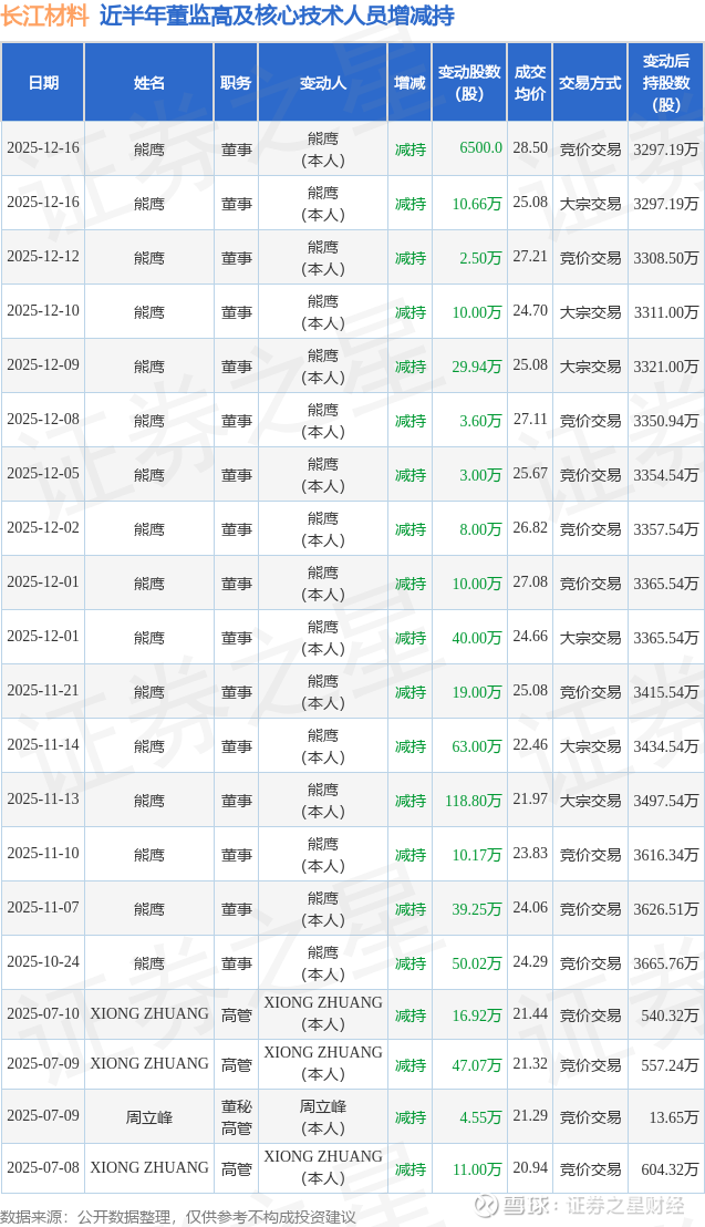 长江材料近半年内的董监高及核心技术人员增减持详情如下: