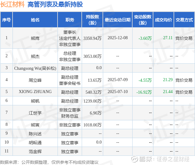 长江材料的高管列表及最新持股情况如下: