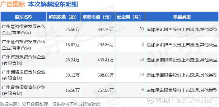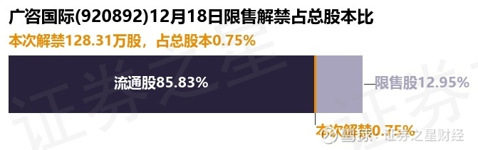证券之星消息,根据市场公开信息整理,广咨国际(920892)于12月18日将有128.31万股限售股份解禁,为公司追加承诺限售股份上市流通,其他类型,占公司总股本0.75%。(本次数据根据历史公告整理得出,实际情况以上市公司最新公告为准)最近一年内,该股累计解禁42.77万股,占总股本的0.25%。本次解禁后,公司还有2206.67万股限售股份,占总股本12.95%。具体如下图所示: