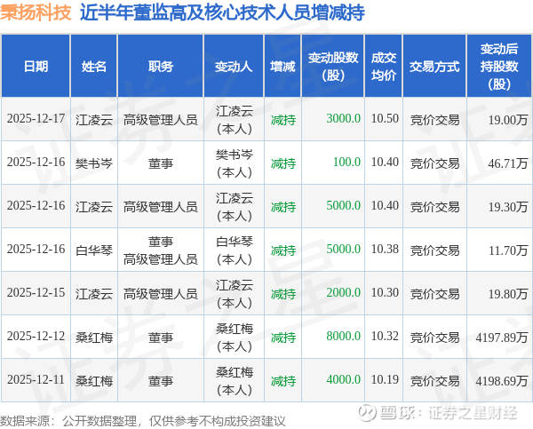 证券之星消息,根据12月18日市场公开信息、上市公司公告及交易所披露数据整理,秉扬科技(920675)最新董监高及相关人员股份变动情况:2025年12月17日公司高级管理人员江凌云共减持公司股份3000.0股,占公司总股本为0.0017%。变动期间公司股价下跌0.48%,12月17日当日收盘报10.32元。