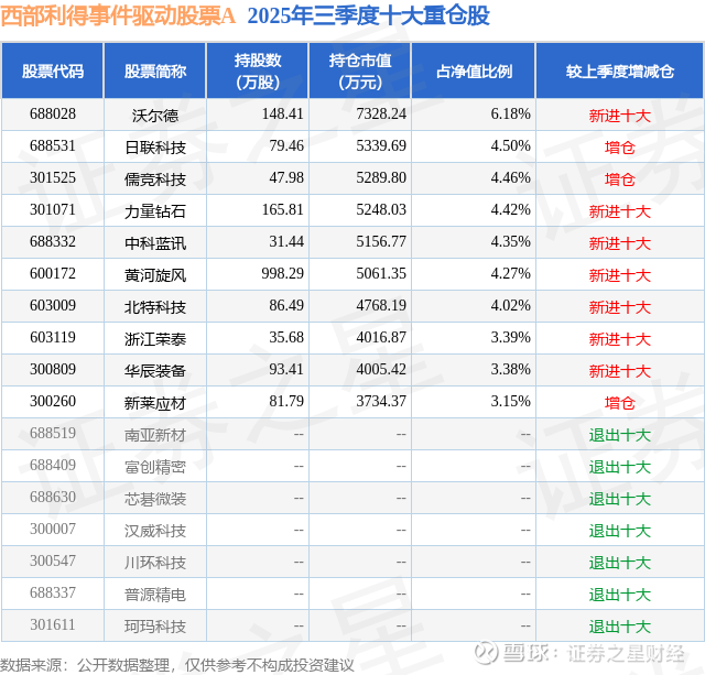 西部利得事件驱动股票A的前十大重仓股如下: