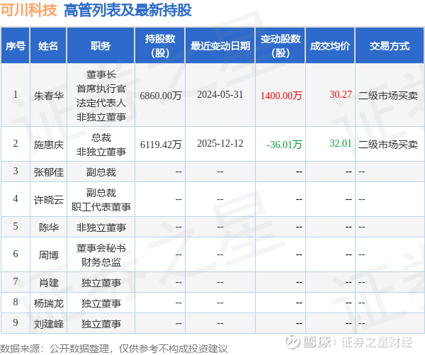 可川科技近半年内的董监高及核心技术人员增减持详情如下: