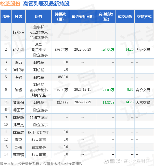 松芝股份近半年内的董监高及核心技术人员增减持详情如下: