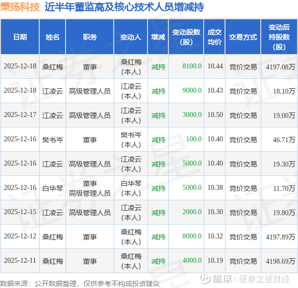 证券之星消息,根据12月19日市场公开信息、上市公司公告及交易所披露数据整理,秉扬科技(920675)最新董监高及相关人员股份变动情况:2025年12月18日公司高级管理人员江凌云、董事桑红梅共减持公司股份1.71万股,占公司总股本为0.0099%。变动期间公司股价上涨0.68%,12月18日当日收盘报10.39元。