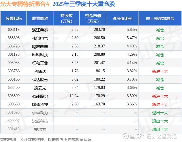 根据2025基金Q3季报公募基金重仓股数据,重仓该股的公募基金共1家,其中持有数量最多的公募基金为光大保德信基金的光大专精特新混合A。光大专精特新混合A目前规模为0.25亿元,最新净值1.082(12月18日),较上一交易日下跌1.21%,近一年上涨26.71%。该公募基金现任基金经理为崔书田。崔书田在任的基金产品包括:光大保德信中国制造2025灵活配置混合A,管理时间为2020年7月1日至今,期间收益率为46.13%;光大新增长混合A,管理时间为2022年8月27日至今,期间收益率为-8.98%;光大保德信研究精选混合A,管理时间为2025年3月19日至今,期间收益率为22.84%。