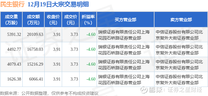 证券之星消息,12月19日民生银行发生大宗交易,交易数据如下: