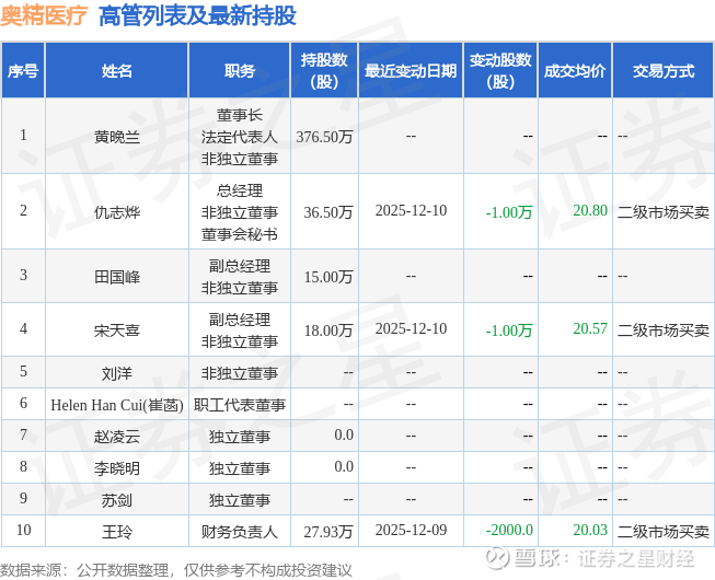 奥精医疗的高管列表及最新持股情况如下: