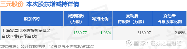 证券之星消息,12月19日三元股份发布公告《三元股份:三元股份关于股东权益变动触及1%刻度的提示性公告》,其股东上海复星创泓股权投资基金合伙企业(有限合伙)于2025年12月17日至2025年12月18日间合计减持1589.77万股,占公司目前总股本的1.0584%,变动期间该股股价下跌1.06%,截止12月18日收盘报5.61元。